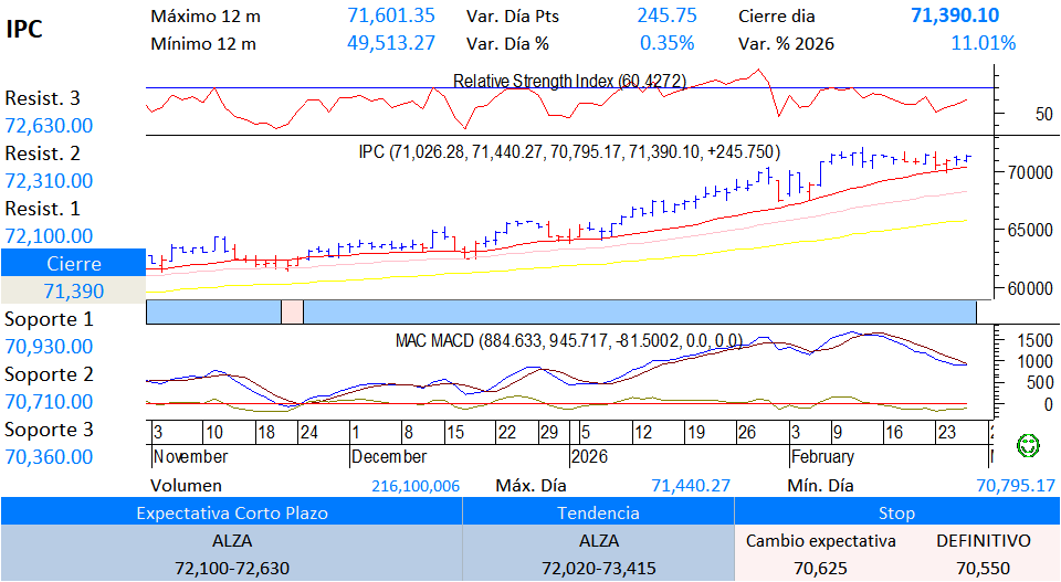 La bolsa (IPyC)Gráficas / Mario Copca / febrero 27, 2026 IPyC: Alza, mantener las compras;Venta gradual si baja de 70,625. La bolsa (IPyC) Leer más »