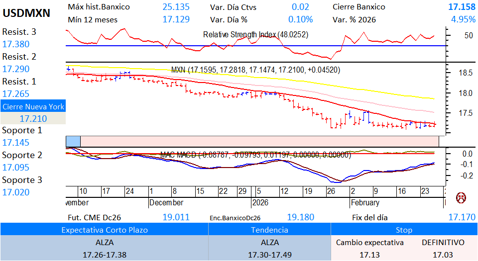El peso mexicanoGráficas / Mario Copca / febrero 27, 2026 Dólar: Alza, mantener coberturas.Venta gradual si baja de 17.13. El peso mexicano Leer más »