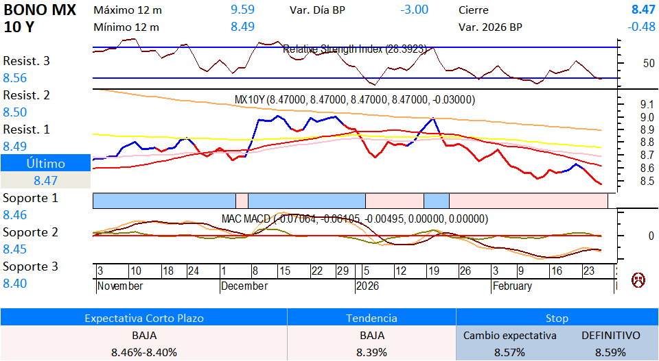 Bono MX10YGráficas / Mario Copca / febrero 27, 2026 Tasas: Baja, mantener las compras;Reducir la exposición si vuelve sobre 8.57%. Bono MX10Y Leer más »