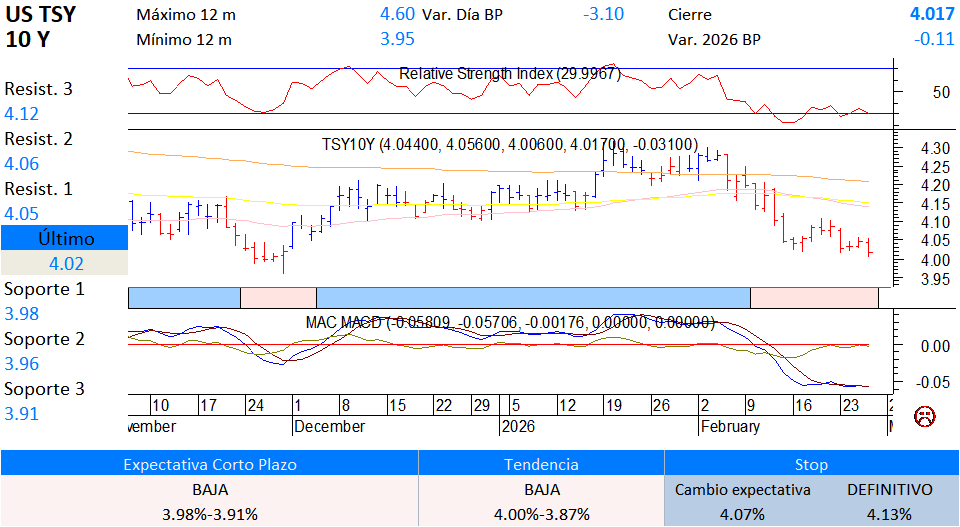 Treasuries US10YGráficas / Mario Copca / febrero 27, 2026 Tasas: Baja, mantener las compras;Reducir la exposición si sube de 4.07%. Treasuries US10Y Leer más »
