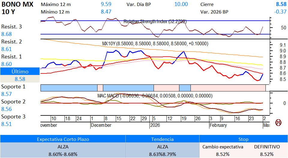 Bono MX10Y Dejar un comentario / Gráficas / Por Mario Copca Tasas: Alza, reactivo riesgo alcista;Rehacer las compras si baja de 8.52%.