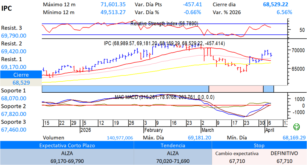 La bolsa (IPyC) Dejar un comentario / Gráficas / Por Mario Copca IPyC: Alza, mantener posiciones;Venta gradual si baja de 67,710.