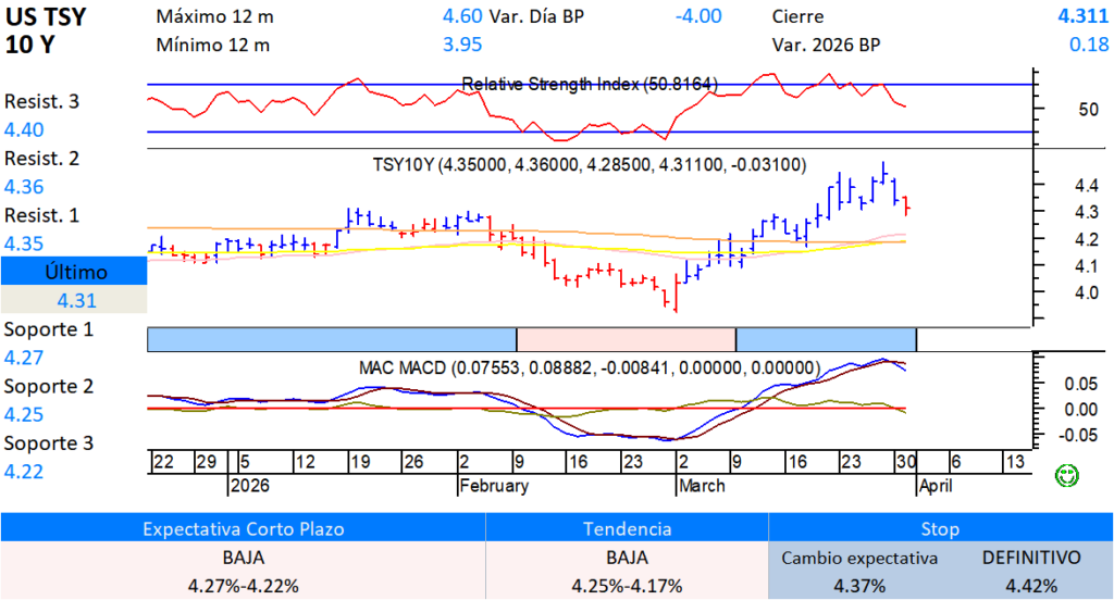 Treasuries US10Y Dejar un comentario / Gráficas / Por Mario Copca Tasas: Baja, rehacer las compras;Venta gradual si vuelve sobre 4.37%.